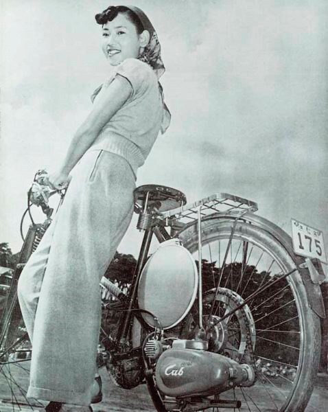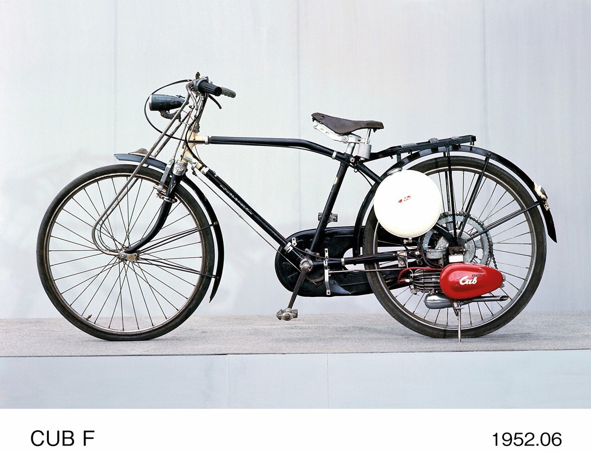 The design of the Cub F-Type – a bicycle with a 50cc two-stroke auxiliary engine – featured: “a red engine with a white fuel tank”. It was a fresh, elegant design, perfect for the vast Japanese public. While planning the marketing strategy, Fujisawa realised that there was a strong distribution network that other motorcycle manufacturers had ignored until then: bicycle shops. He contacted over 50,000 bike shops throughout the country by post. Fujisawa designed the marketing brochure and his efforts paid off. With a woman at the handlebars, the Cub F-Type became known as the bicycle that both men and women could ride. The model was sold in more than 15,000 bike shops and was widely used across the whole of Japan.